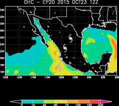 For the entire region now features ocean surface temperatures in the range of 30 to 31 C (86 to 88 F) or about 2-3 degrees Celsius above average. It’s heat fed by an El Nino that could be one of the top three strongest on record. Heat further intensified by a human forced warming of the globe that has now hit about 1 C above 1880s levels. Heat that would allow Patricia to hit never before seen heights of storm force in a period of extraordinarily rapid intensification. They call it bombification for a reason. Pressures drop rapidly, wind speeds rage to epic force, and the storm presents a tell-tale angry red signature in the infrared satellite shot. During recent years, bombification has become an all-too-common word associated with ocean storms that are now feeding on unprecedented amounts of heat, moisture, and temperature differentials. Some have even claimed that Hansen’s terrifying ‘Storms of My Grandchildren’ are starting to arrive early. But what happened with Patricia was even outside the new abnormal bombification ‘norm.’