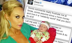 The 36-year-old slammed those accusing her of not looking after her baby right on Monday. Criticised: Coco Austin has taken to Twitter to defend herself after she was accused of being a 'celebrity mom' and leaving her daughter Chanel with an army of helpersShe wrote: 'Some comments really frustrate me at times..